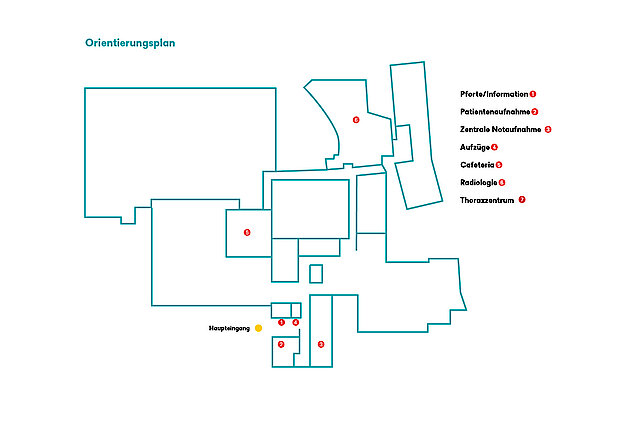 Zur Orientierung finden Sie hier eine Übersicht der patientenrelevanten Anlaufstellen im Erdgeschoss des EvK Herne.